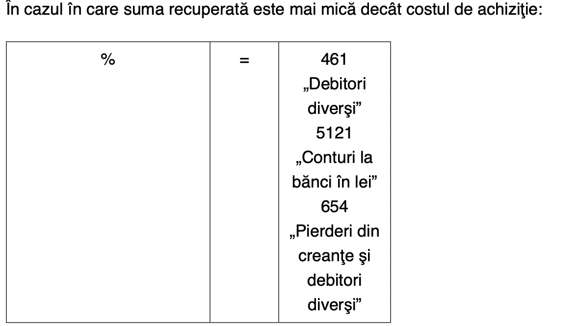 In acest caz, pierderea neta reprezinta diferenta dintre pretul de cumparare si pretul de cesiune, adica 3.000 lei. Ca urmare, cheltuiala recunoscuta fiscal este de 900 lei (3.000 x 30%). In final, creanta este preluata de o persoana juridica cu statut fiscal de microintreprindere M. Aceasta isi inregistreaza in evidenta proprie creanta la valoarea de cesiune de 95.000 lei.