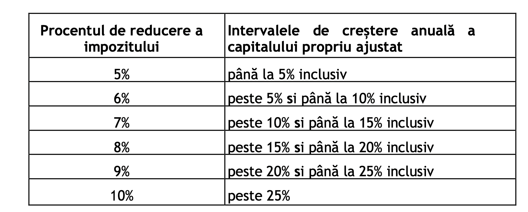 b) daca inregistreaza o crestere anuala a capitalului propriu ajustat al anului pentru care datoreaza impozitul fata de capitalul propriu ajustat inregistrat in anul precedent si indeplineste concomitent conditia prevazuta la lit. a), reducerile au urmatoarele valori: