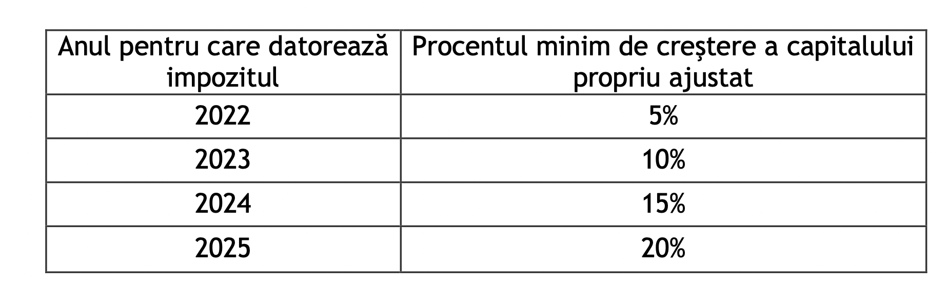c) 3%, daca inregistreaza o crestere peste nivelul prevazut in tabelul de mai jos a capitalului propriu ajustat al anului pentru care datoreaza impozitul fata de capitalul propriu ajustat inregistrat in anul 2020 si daca indeplineste concomitent conditia prevazuta la lit. a).