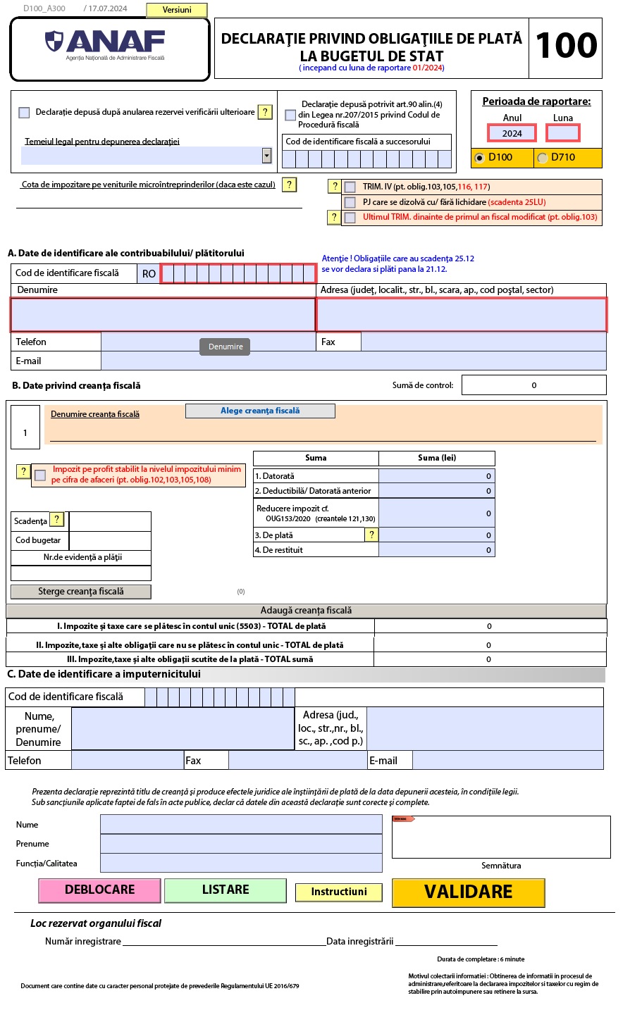 Declaratia 100 este formularul oficial utilizat pentru raportarea si plata obligatiilor fiscale catre bugetul de stat de catre toti contribuabilii care datoreaza impozite si contributii fiscale. Documentul este esential pentru conformarea fiscala, permitand calcularea si plata corecta a obligatiilor fiscale. Completarea incorecta/incompleta si nerespectarea termenelor de depunere a declaratiei poate duce la plata penalitatilor si alte sanctiuni fiscale.Cine are obligatia depunerii declaratiei 100 la ANAF