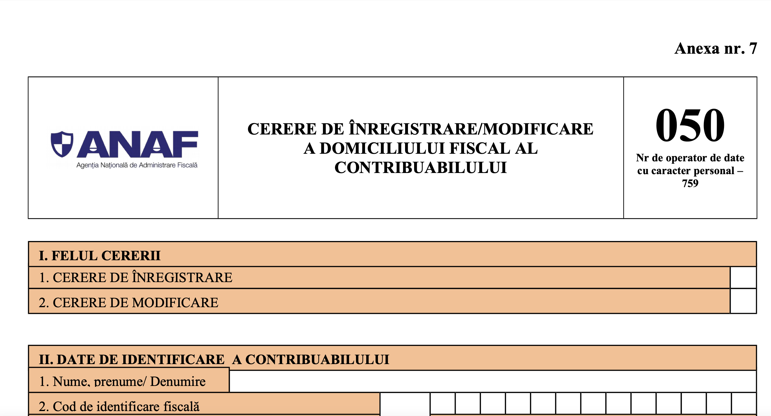 7 modificari fiscale in saptamana 28 - 31 decembrie 2020Domiciliul fiscal si FORMULARUL 050. Comunicat FinanteFORMULARUL 050 si schimbarea domiciliului fiscal. Cum depunem cererea?Modificare sediu social. Stabilirea domiciliului fiscal la locul conducerii efective a afaceriiInregistrarea domiciliului fiscal al contribuabilului. Prevederi ANAFSfaturi de la experti