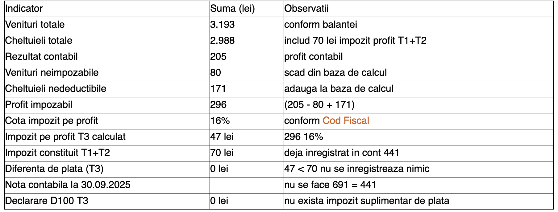Avem acest caz. Conform balantei contabile la data de 30.09.2025 avem: venituri totale 3193 lei, cheltuieli totale 2988 lei (inclusiv imp pe profit trim I II in suma de 70 lei), rezultat contabil 205 lei. La calculul impozitului pe profit am tinut cont de venituri neimpozabile 80 lei, cheltuieli nedeductibile 171 lei si am obtinut un profit impozabil 296 lei si un impozit profit 16% in suma de 47 lei.