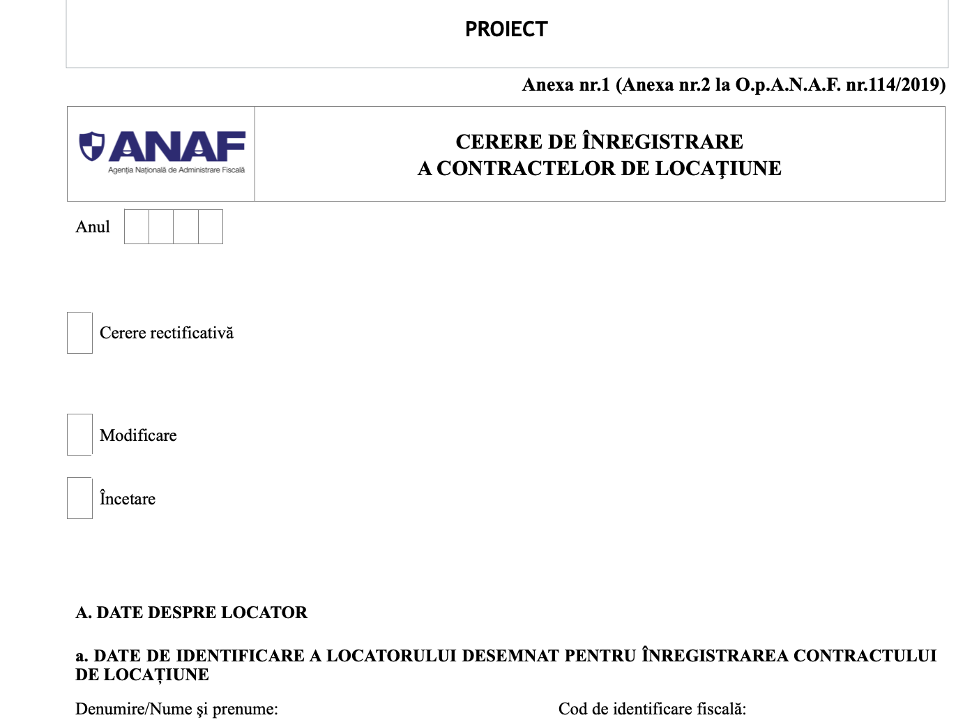 ANAF a pus in dezbatere publica un nou Proiect de Ordin, pentru aprobarea Procedurii de inregistrare a contractelor de locatiune, precum si a modelului si continutului formularului „Cerere de inregistrare a contractelor de locatiune".