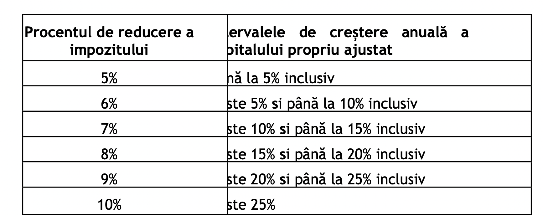b) daca inregistreaza o crestere anuala a capitalului propriu ajustat al anului pentru care datoreaza impozitul fata de capitalul propriu ajustat inregistrat in anul precedent si indeplineste concomitent conditia prevazuta la lit. a), reducerile au urmatoarele valori: