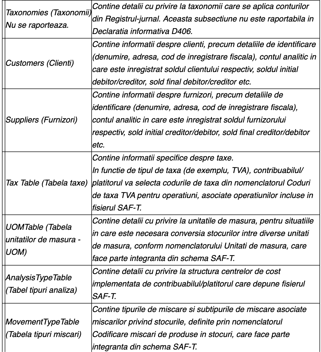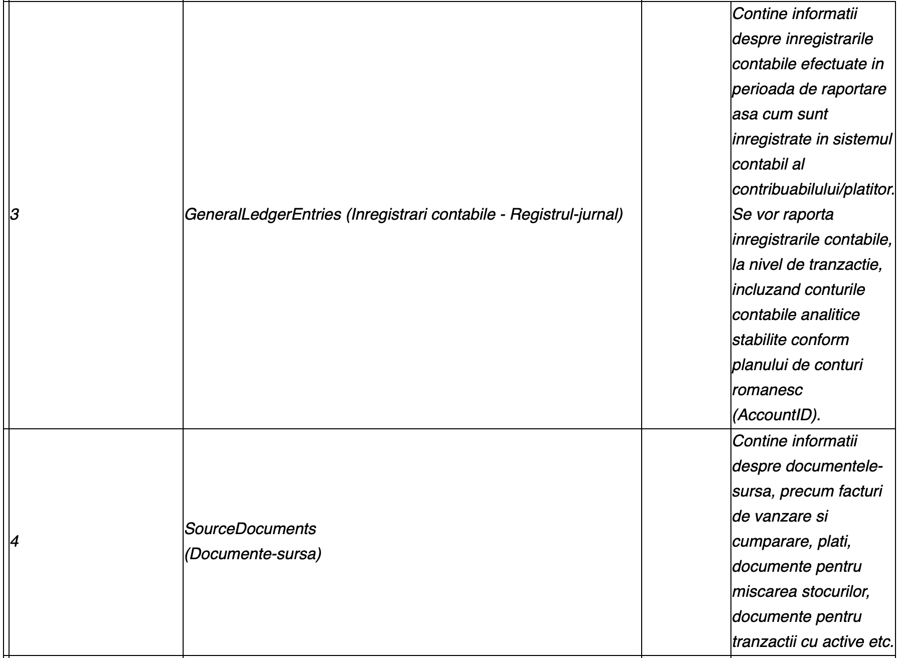 5. In tabelul de mai jos sunt prezentate sectiunile si subsectiunile raportabile prin SAF-T, definind structura SAF-T obligatorie pentru Romania, pe baza recomandarilor OCDE versiunea 2.0.