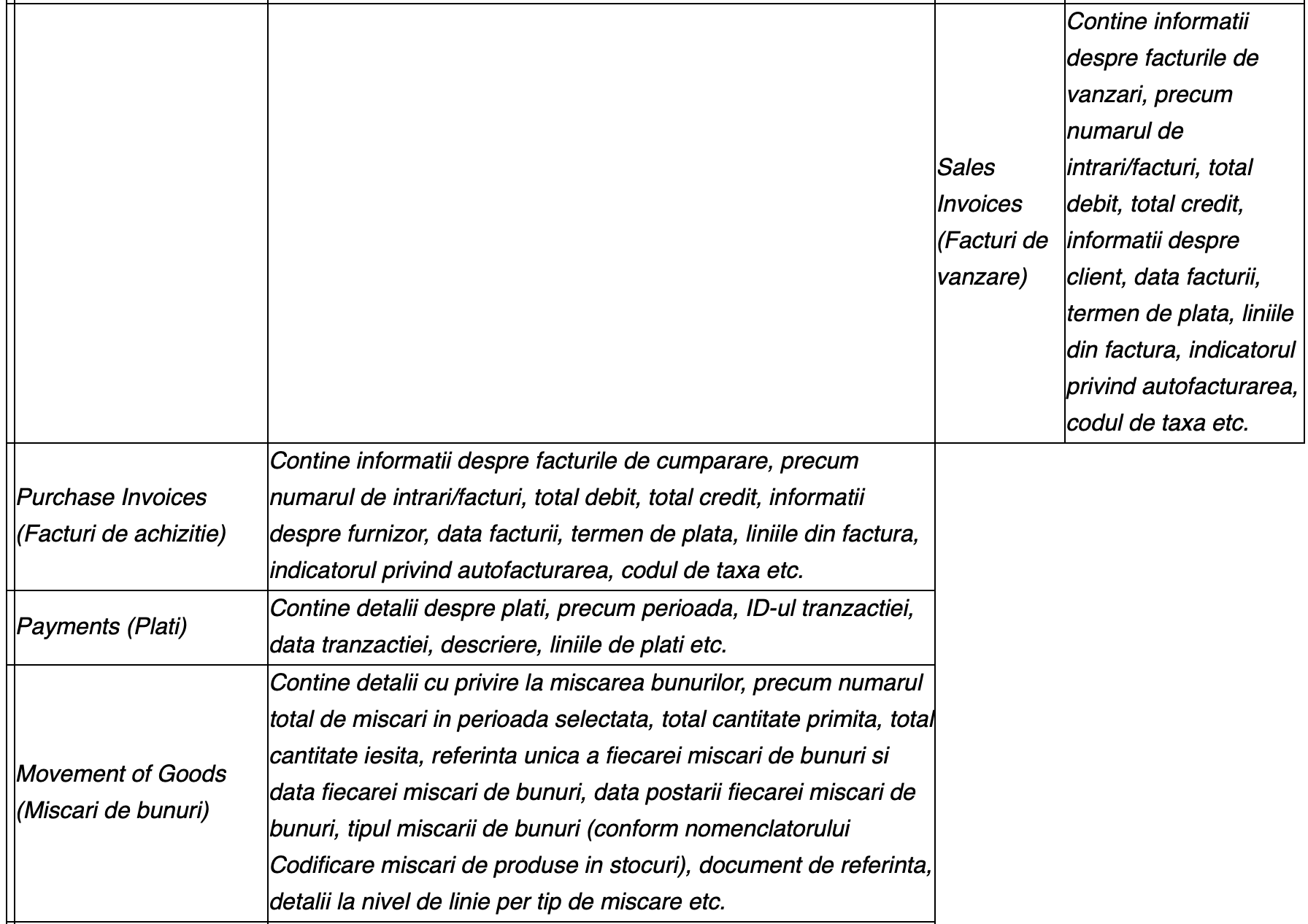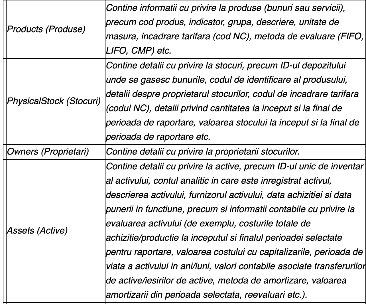 In ceea ce priveste stocurile, conform Ordinului 1783/2021, informatiile privind „stocurile de produse“ sunt transmise doar pe baza unei solicitari specifice din partea organelor fiscale centrale; in functie de perioada pentru care se solicita furnizarea informatiilor privind stocurile prin fisierul standard de control fiscal (SAF-T), contribuabilii furnizeaza una sau mai multe declaratii informative cuprinzand subsectiunile din fisierul SAF-T relevante pentru „Stocuri“, separate pentru fiecare dintre lunile/trimestrele calendaristice cuprinse in perioada pentru care a fost trimisa solicitarea din partea organelor fiscale centrale.