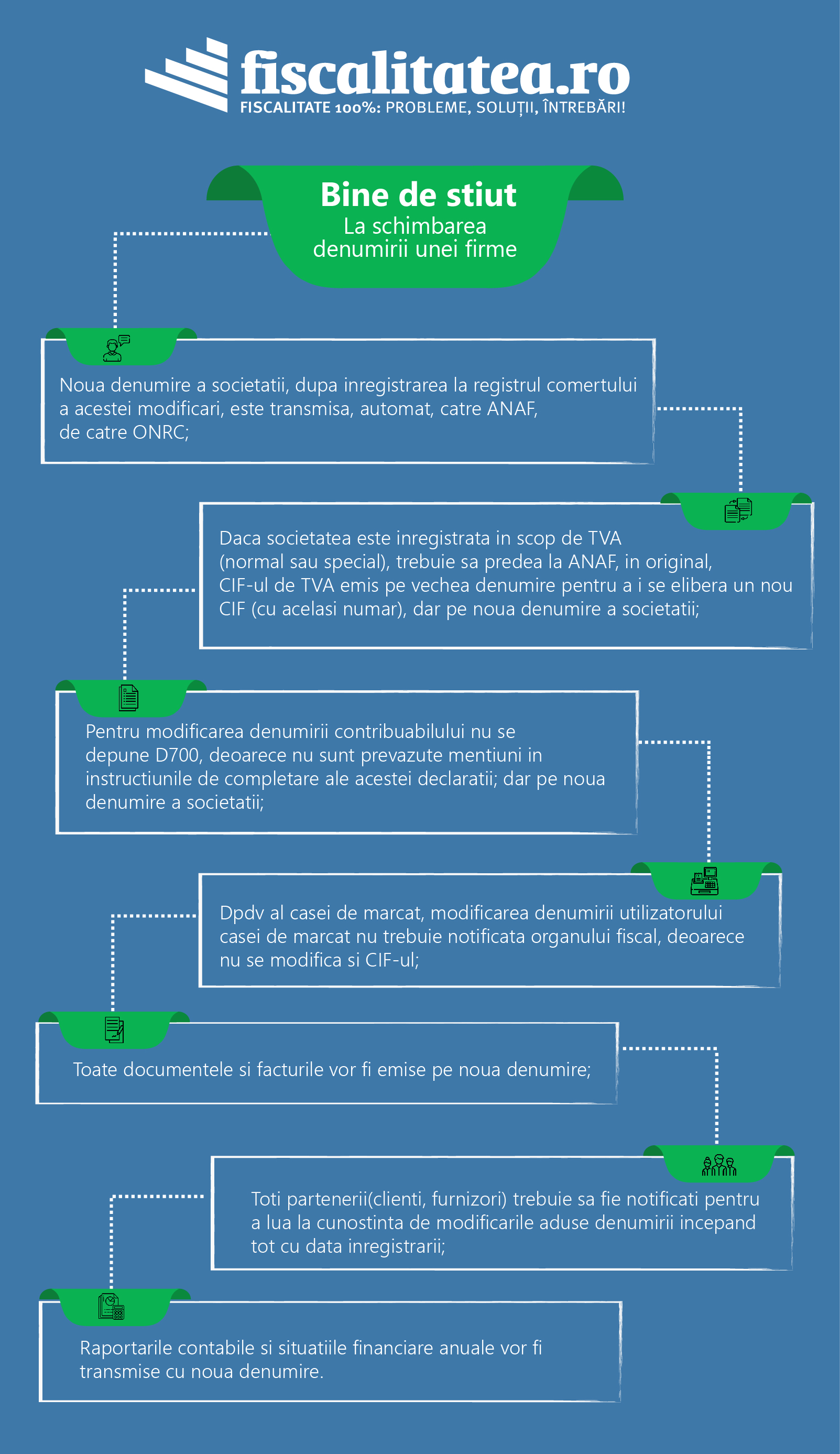 - Noua denumire a societatii, dupa inregistrarea la registrul comertului a acestei modificari, este transmisa, automat, catre ANAF, de catre ONRC;